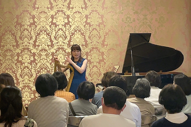 ハープの説明、曲の紹介などしている様子。
